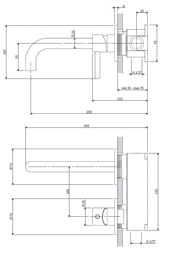 - zasięg wylewki od powierzchni płytek: 16-18,5 cm (zależny od głębokości montażu baterii w ścianie)