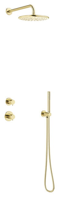 Zestaw Montażowy Silhouet DS 1 w mosiądzu PVD zapewnia elegancki i ciepły wygląd Twojej łazienki. Zestaw składa się z deszczownicy z przyłączem ściennym, prysznica ręcznego oraz termostatu z przełącznikiem 2-drogowym, umożliwiającego łatwą obsługę opcji prysznica.