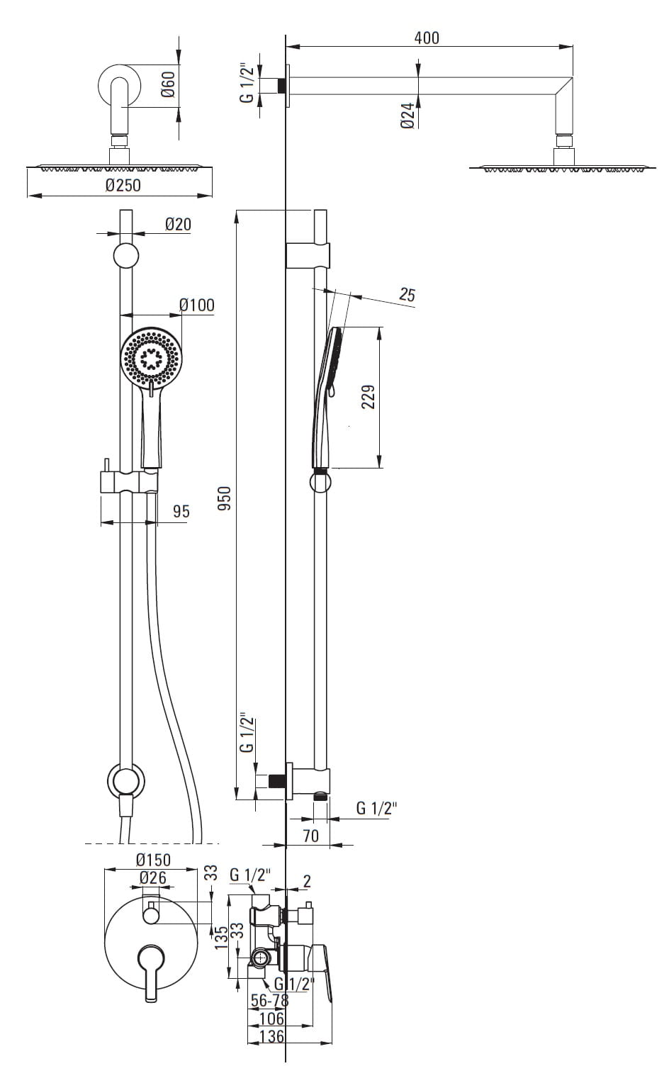 W skład zestawu wchodzi słuchawka prysznicowa z wężem, umocowana na eleganckim drążku, głowica natryskowa oraz bateria podtynkowa.