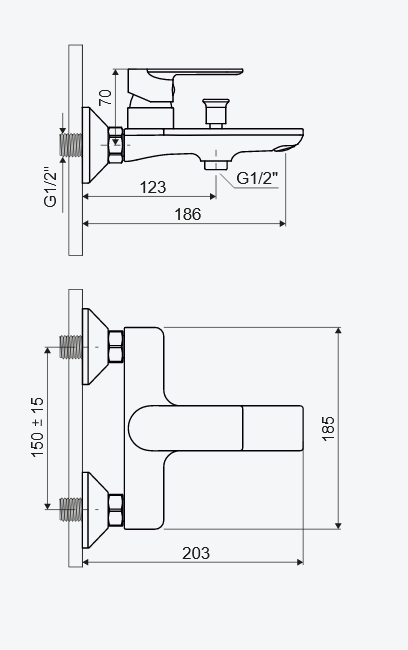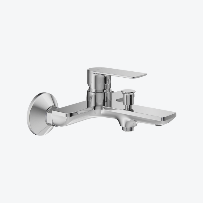 Bateria wannowa ścienna posiada standardowy rozstaw mocowań (150mm) oraz komplet krzywek montażowych, która zapewniają 15mm zakres regulacji. Dzięki temu bateria może być instalowana do każdej prawidłowo wykonanej instalacji pod baterię wannową. Posiada wysięg wylewki 186mm, który pozwala na stosowanie do większości wanien z oferty Excellent (minimalna długość wylewki baterii ściennej podana jest w tabeli charakteryzującej każdą wannę). Ciśnieniowy przełącznik funkcji w postaci pociąganego pokrętła znajduje się na górze wylewki, pod uchwytem baterii. Jej idealnym uzupełnieniem będą zestawy prysznicowe punktowe.