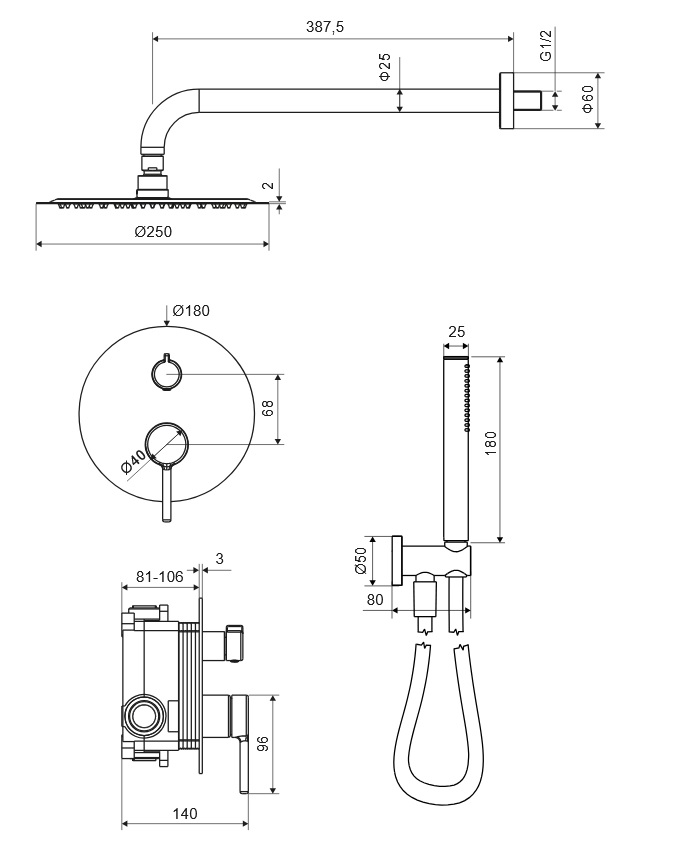 Podtynkowy zestaw Pi obejmuje 3-funkcyjną baterię prysznicowo-wannową z systemem Fix-Box, który ułatwia montaż oraz zapewnia stały dostęp rewizyjny do mechanizmu. W skład kompletu wchodzi również górna deszczownica Slim o średnicy 25 cm z silikonowymi wypustkami, wzmocnione ramię prysznicowe oraz zestaw punktowy z uchwytem na słuchawkę, elegancką metalową słuchawką prysznicową i wężem.