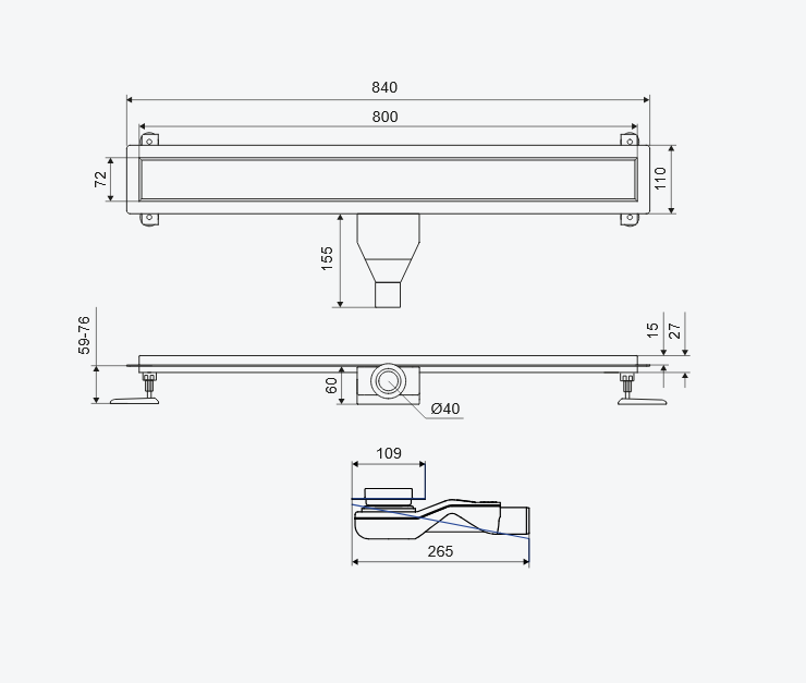 Odpływ posiada wygodną regulację nóżek w pionie i w poziomie w zakresie do 30mm.