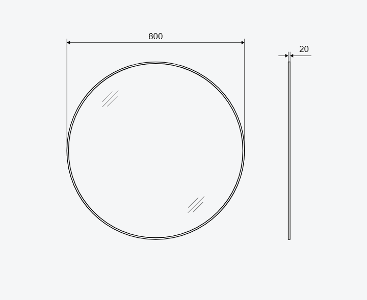 Tafla szkła jest dodatkowo zabezpieczona podklejoną z tyłu folią ochronną, która w razie stłuczenia lustra niweluje możliwość rozpryśnięcia się odłamków szkła i skaleczenia przez użytkownika. Dostępne średnice luster: 600 mm oraz 800 mm. Dostępne kolory ramy: anoda czarny mat lub złota szczotkowana oraz lakierowany biały mat.