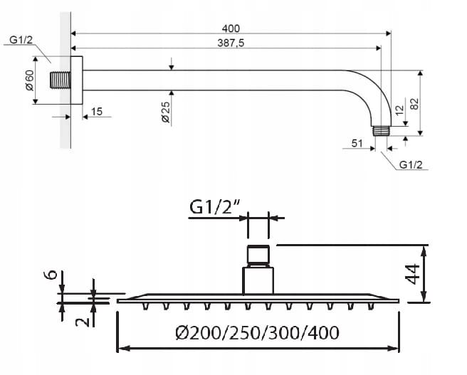 Vedo deszczownica metalowa ultra slim 20 cm z ramieniem mosiężnym chromowanym 38,7 cm, wzmacnianym.