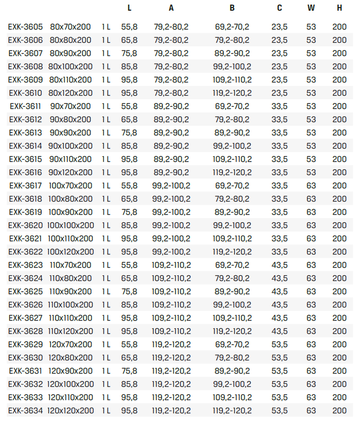 Wymiar podano w kolejności drzwi x ścianka boczna x wysokość.