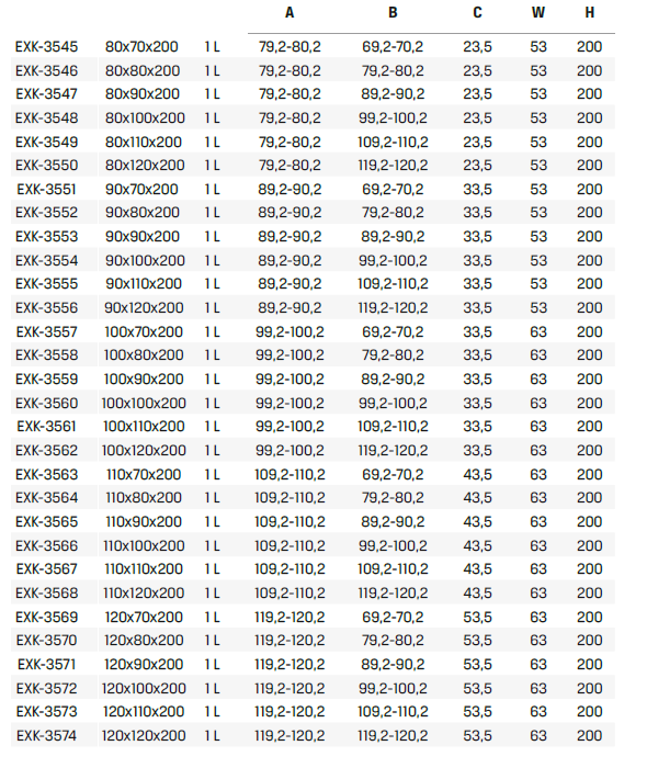 Wymiar podano w kolejności drzwi x ścianka boczna x wysokość.
