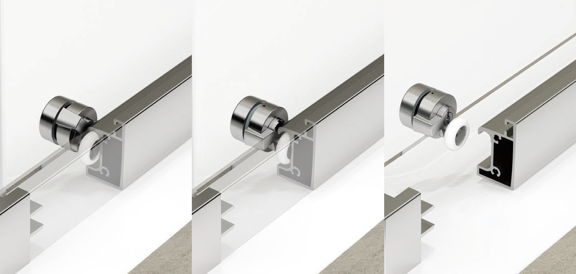 Nowy, szybki system górnej regulacji, całkowicie ukryty, pozwala na zamocowanie profilu kabiny prysznicowej do ściany i łatwą regulację jego