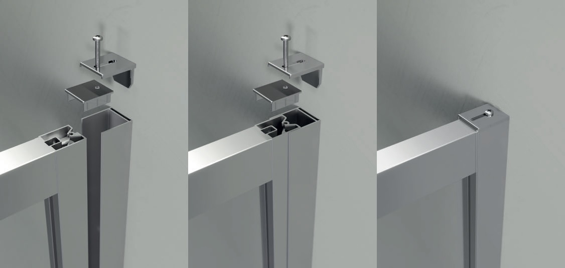 Nowy, szybki system górnej regulacji, całkowicie ukryty, pozwala na zamocowanie profilu kabiny prysznicowej do ściany i łatwą regulację jego