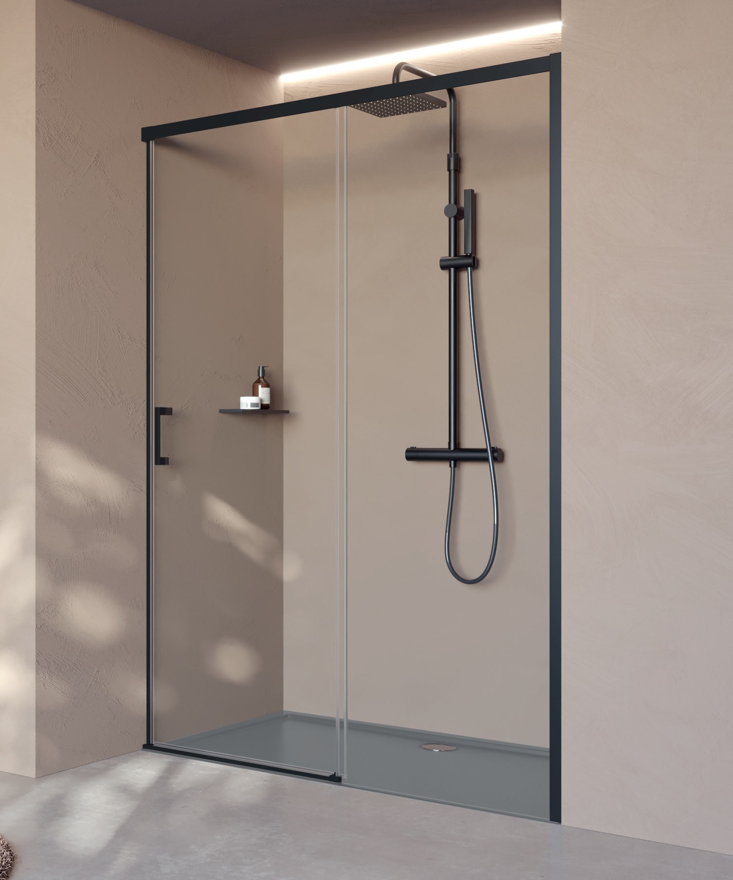 Novellini CLICK PH drzwi przesuwne do wnęki lub do połączenia ze ścianką boczną rozmiar 165 cm profil czarny mat