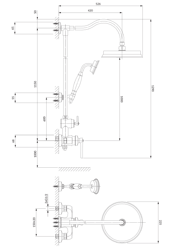 - deszczownica mosiężna, rozmiar: ø22,5 cm, zasięg od ściany: 42 cm