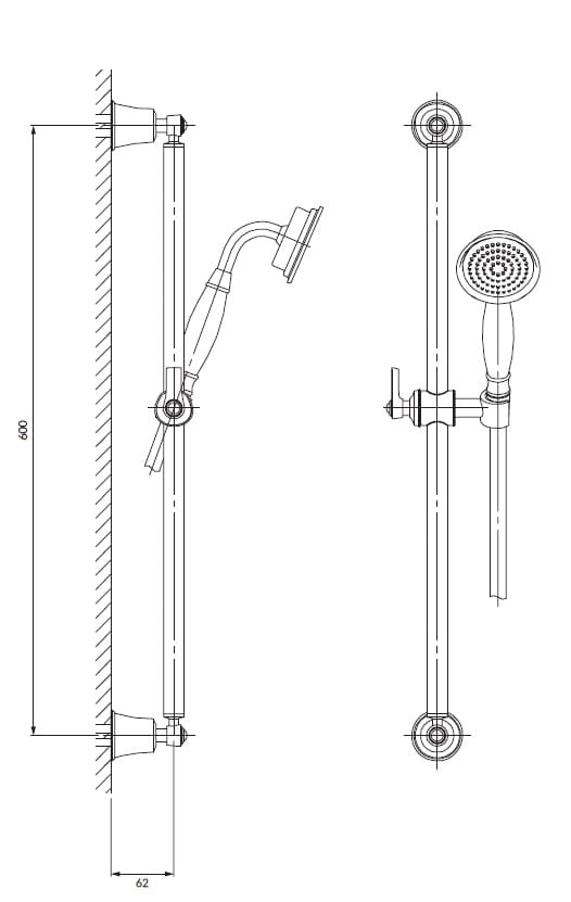 - drążek prysznicowy mosiężny, długość: 64 cm, rozstaw mocowań: 60 cm