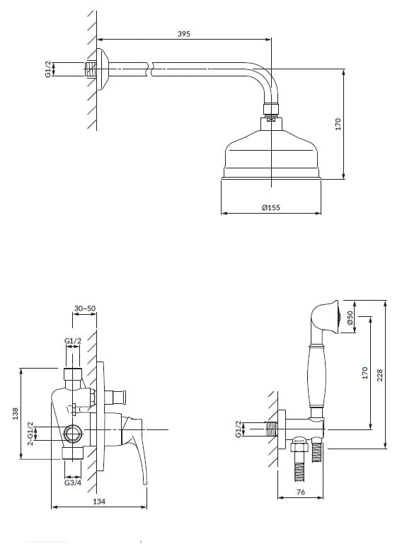 - ramię prysznicowe mosiężne, zasięg: 40 cm