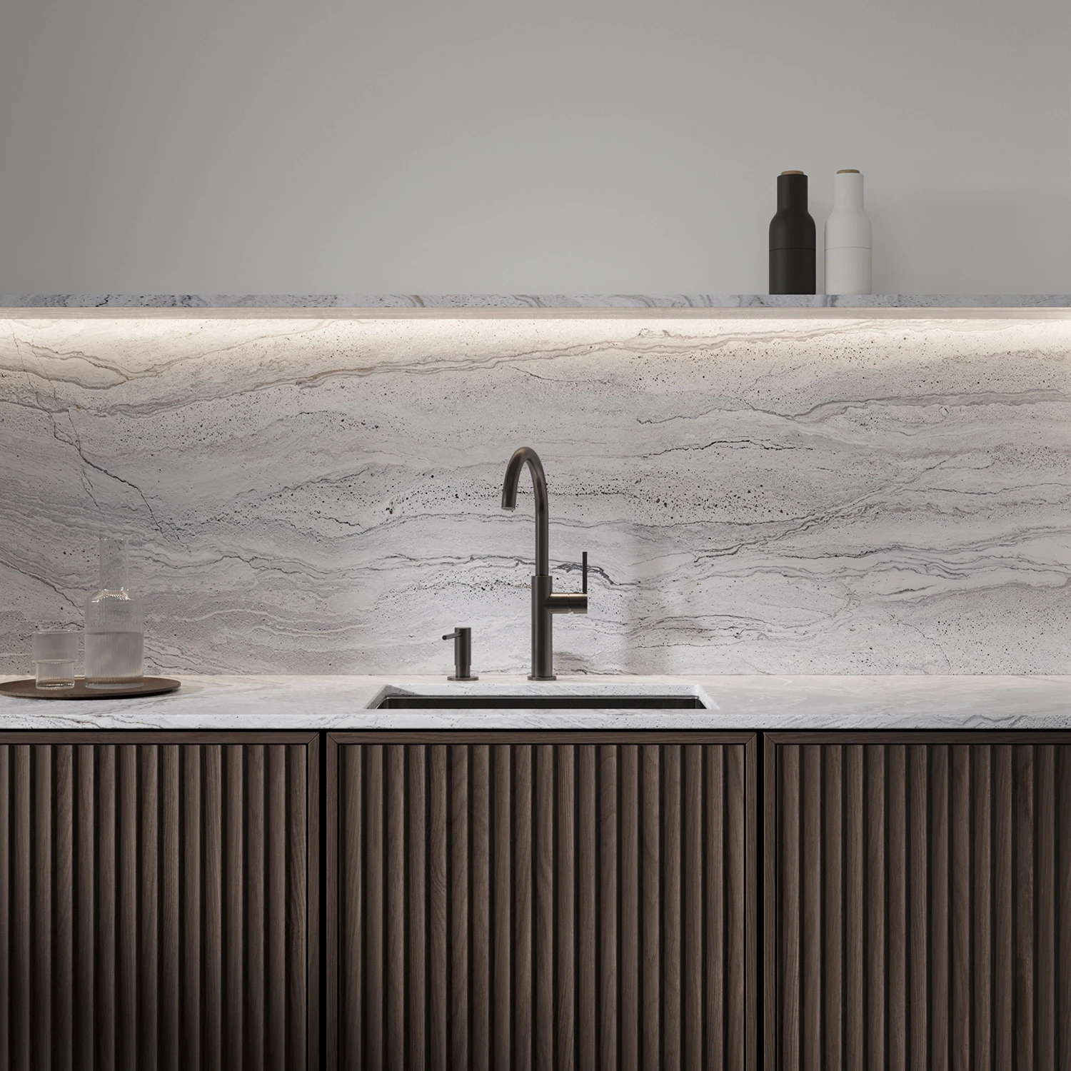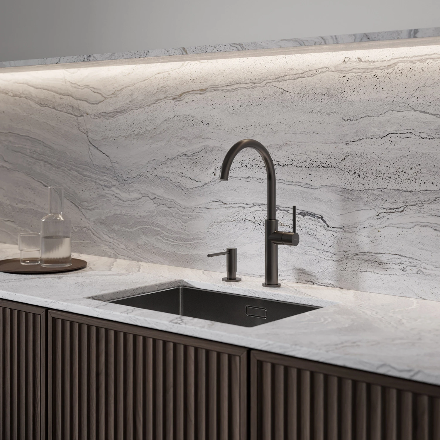 Grafit jest intrygującym wykończeniem w odcieniu metalicznej szarości, o satynowej, szczotkowanej powierzchni.