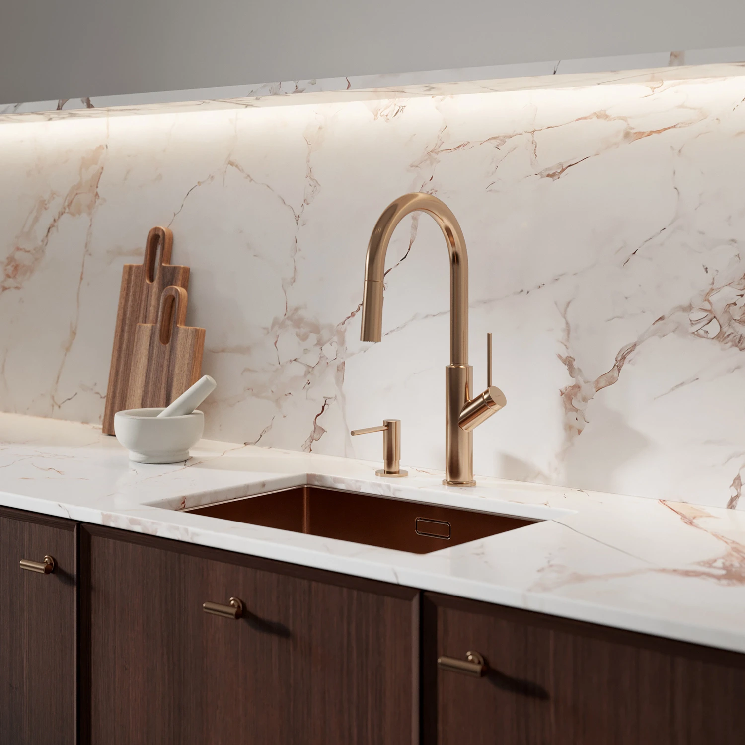 Miedź szczotkowana jest szlachetnym wykończeniem o ciepłej czerwonobrązowej barwie i satynowej powierzchni. Powłoka została wykonana w zaawansowanej technologii PVD.