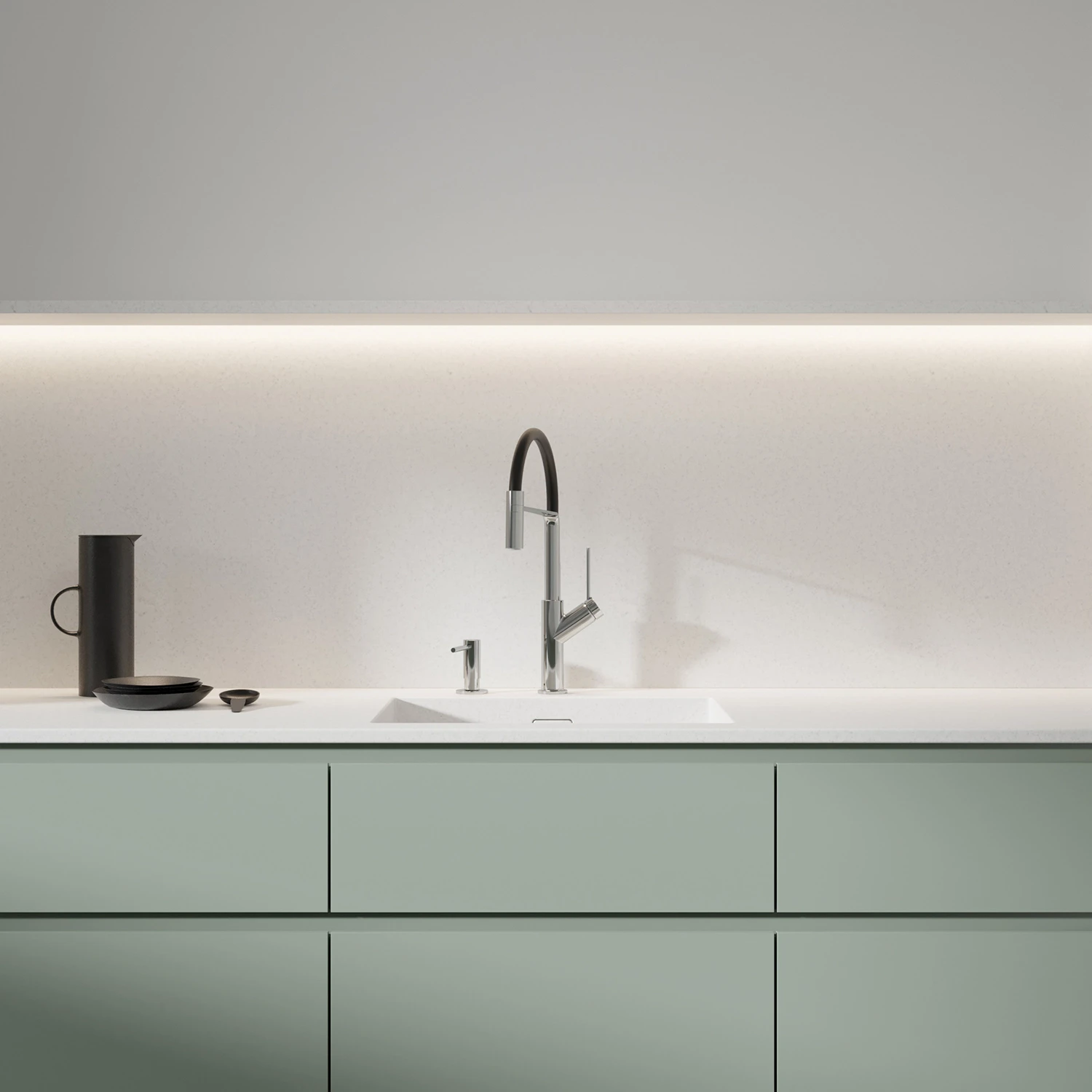 Bateria kuchenna OMNIRES VITA to połączenie dopracowanej formy z najwyższą funkcjonalnością. Jej nowoczesny, minimalistyczny design opiera się na geometrycznych kształtach łuku, tworząc lekką i spójną wizualnie sylwetkę. Obrotowa wylewka z funkcją prysznica może zostać wypięta, co pozwala precyzyjnie kierować strumień wody w każde miejsce. Elastyczna, gumowa część w kolorze czarnym zwiększa wygodę obsługi, a optymalna wysokość baterii ułatwia codzienne użytkowanie. Model wyposażono w wysokiej klasy głowicę ceramiczną oraz innowacyjne rozwiązania technologiczne, które pozwalają ograniczyć zużycie wody o połowę, zapewniając jednocześnie wygodę i łatwość użytkowania.