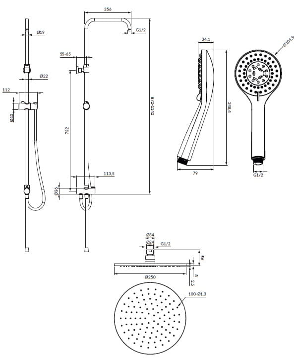 - kolumna prysznicowa z przełącznikiem i ramieniem do montażu deszczownicy
