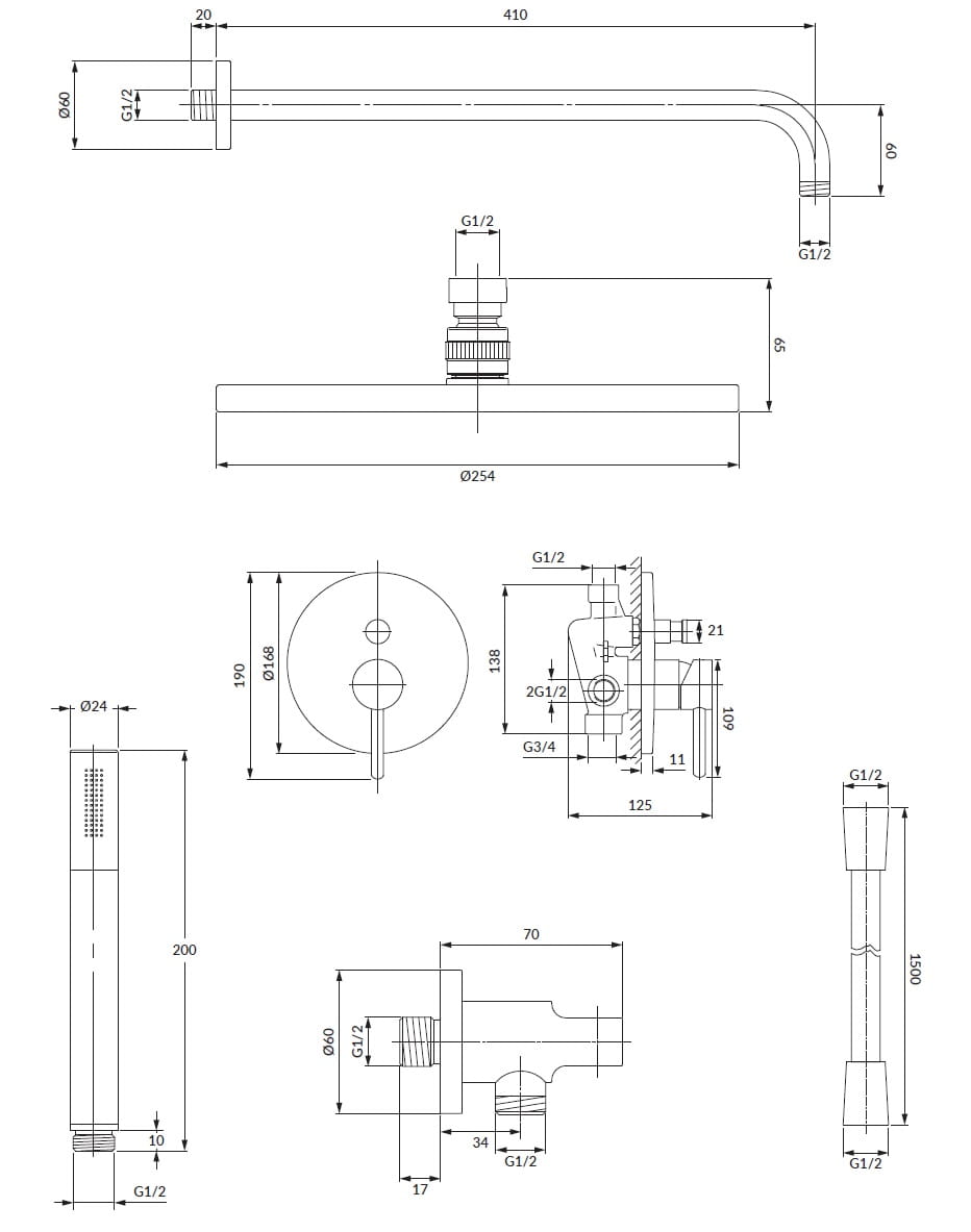 - deszczownica mosiężna z ramieniem (WGSET1GR), rozmiar: ø25 cm, zasięg od ściany: 41 cm
