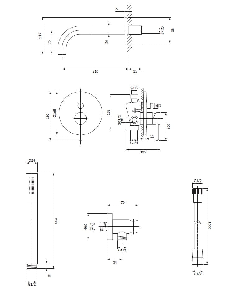 - wylewka ścienna (WDYGL), zasięg wylewki: 21 cm