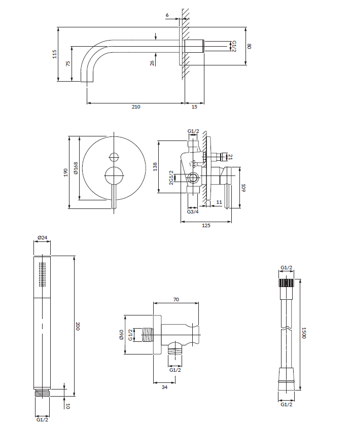 - wylewka ścienna (WDYGLB), zasięg wylewki: 21 cm