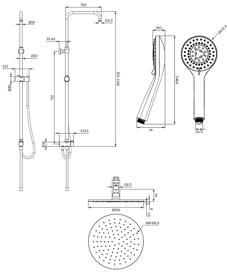 - kolumna prysznicowa z przełącznikiem i ramieniem do montażu deszczownicy