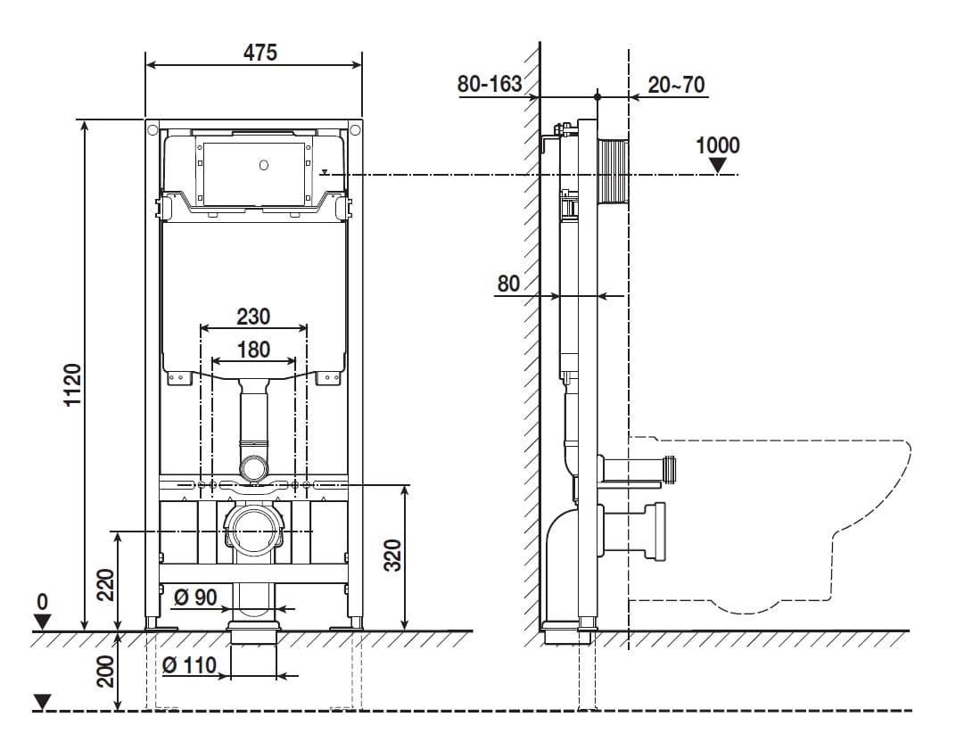 Stelaż podtynkowy do misek wc podwieszanych, do zabudowy lekkiej.