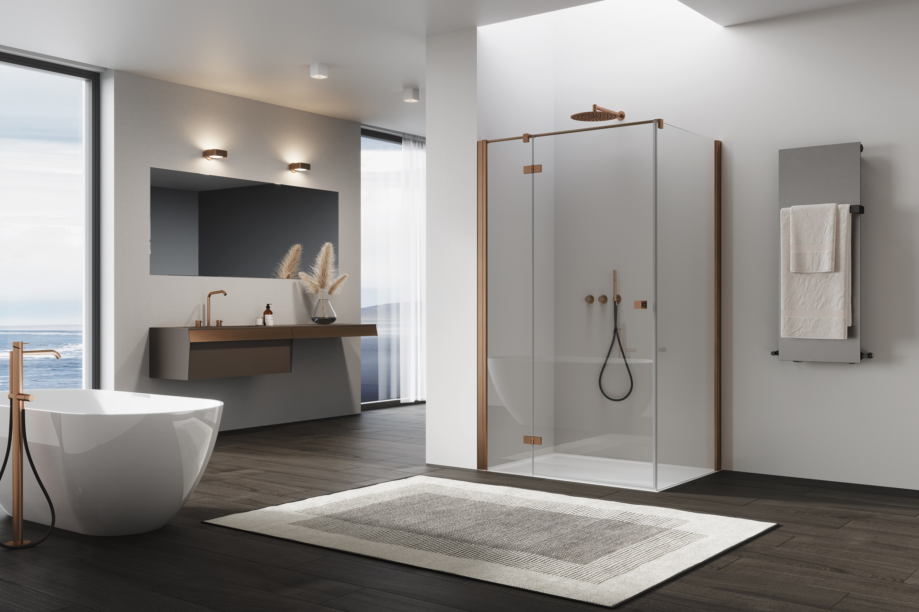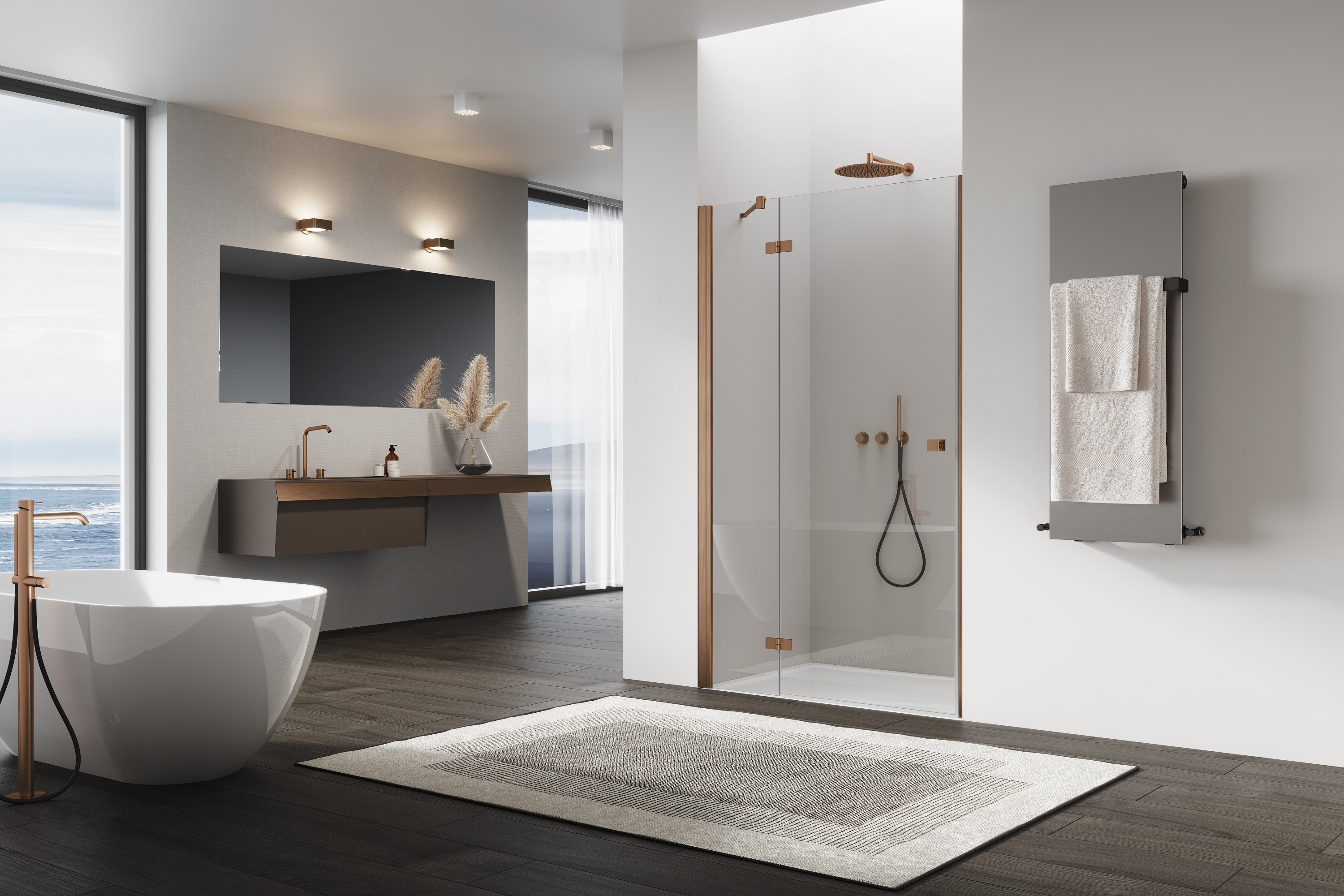 Ronal ANNEA DRZWI 100 cm lewe JEDNOCZĘŚCIOWE ZE ŚCIANKĄ STAŁĄ W LINII Miedź szczotkowana AN13G10002707