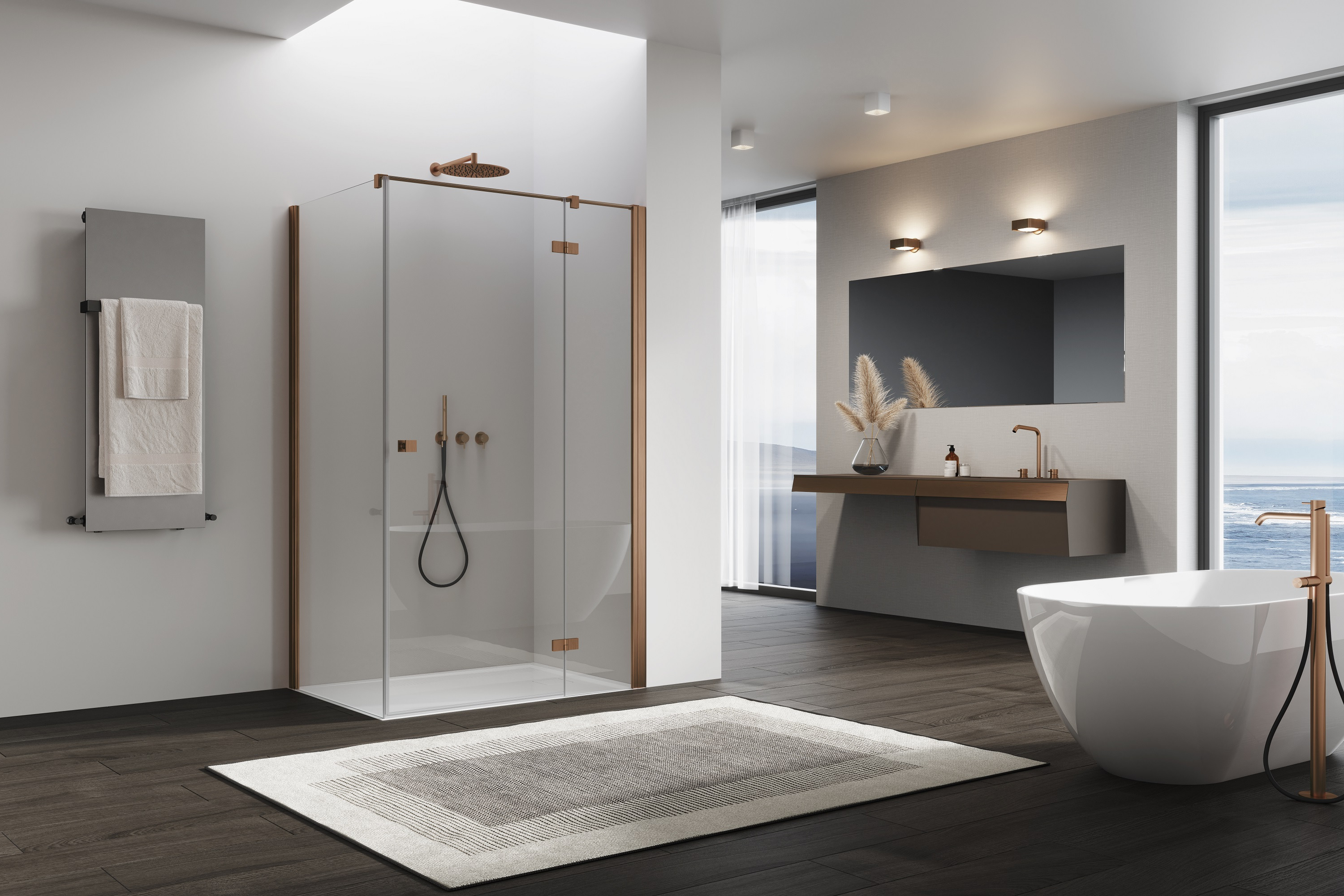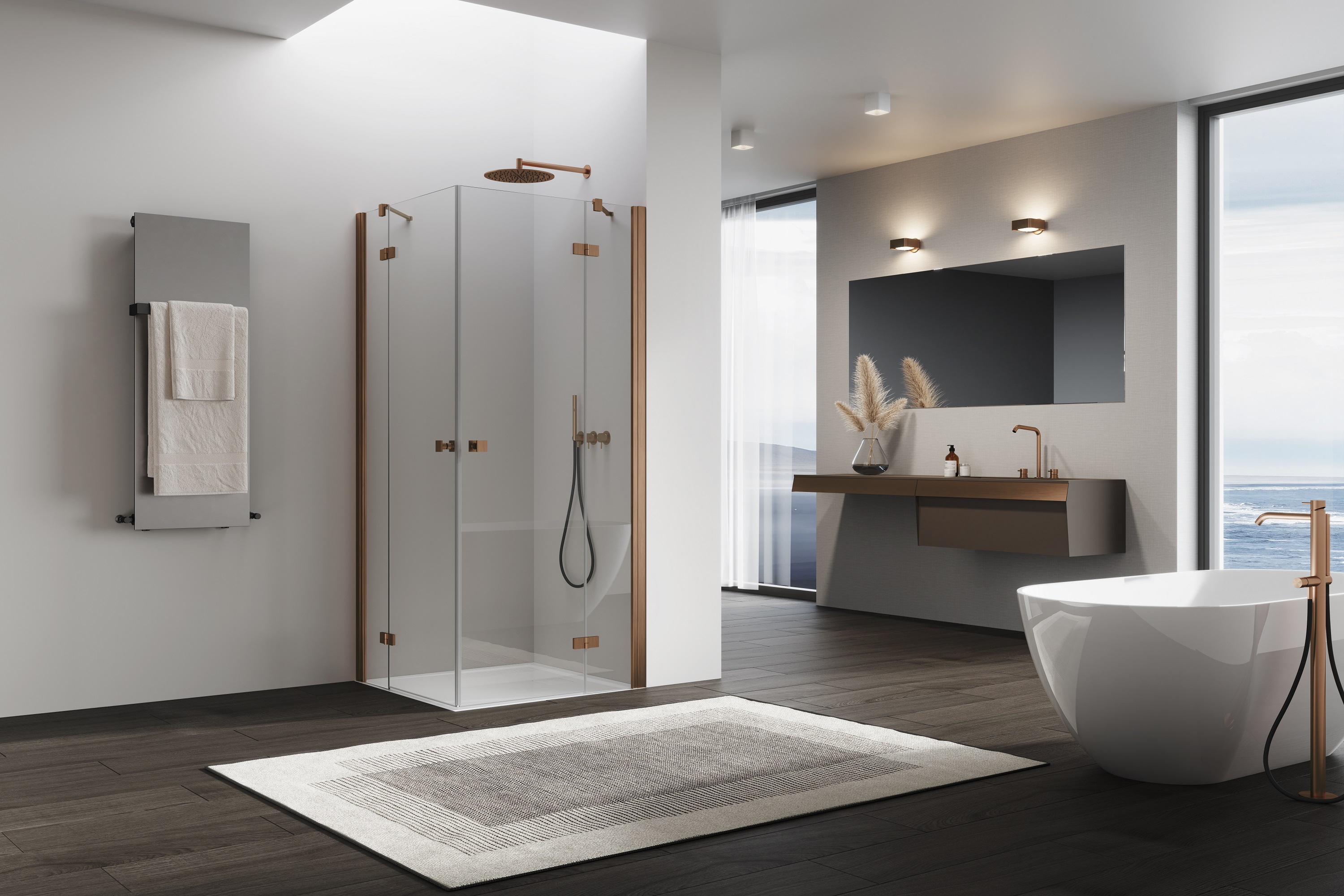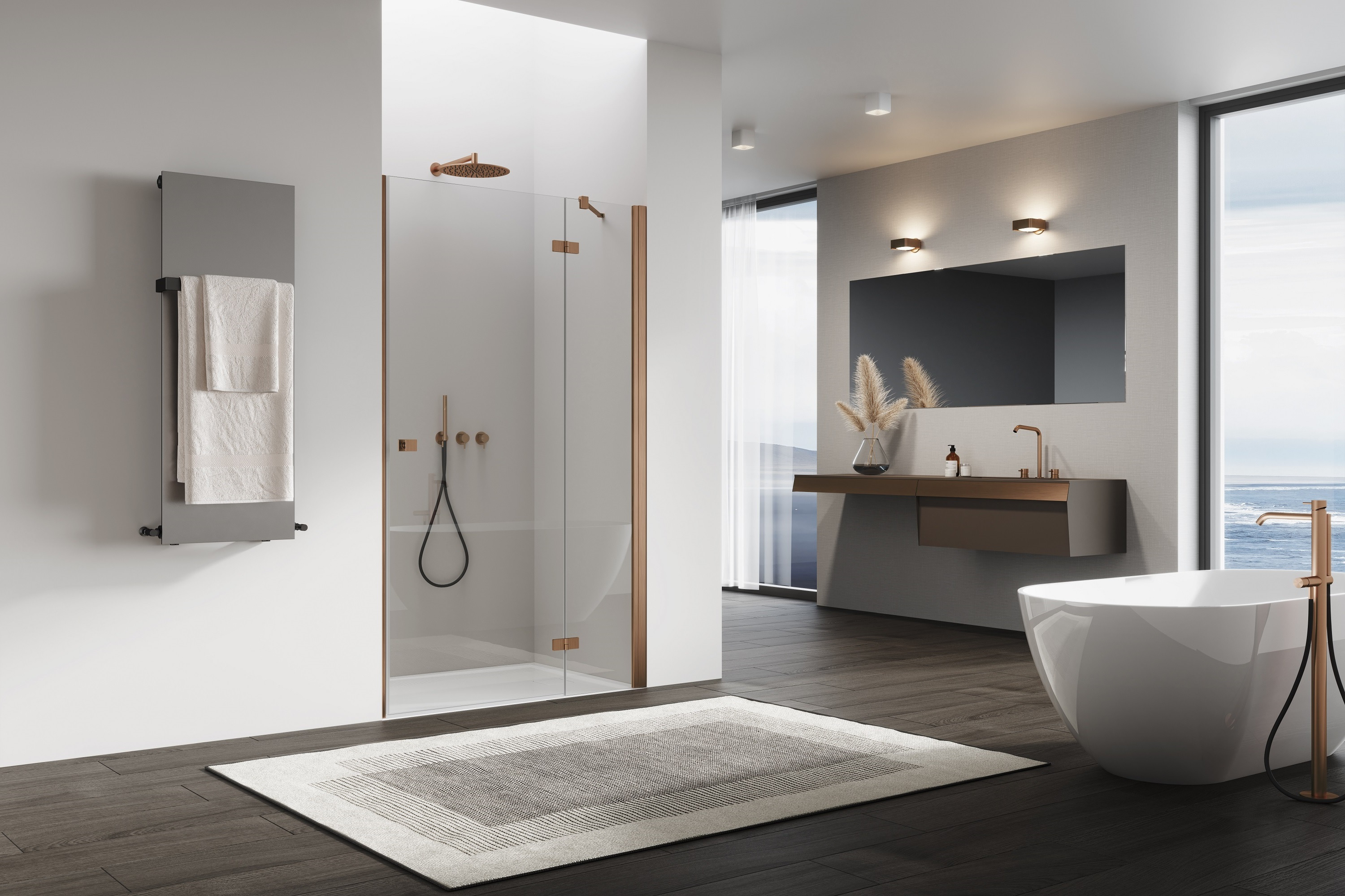 Ronal ANNEA DRZWI 100 cm prawe JEDNOCZĘŚCIOWE ZE ŚCIANKĄ STAŁĄ W LINII Miedź szczotkowana AN13D10002707