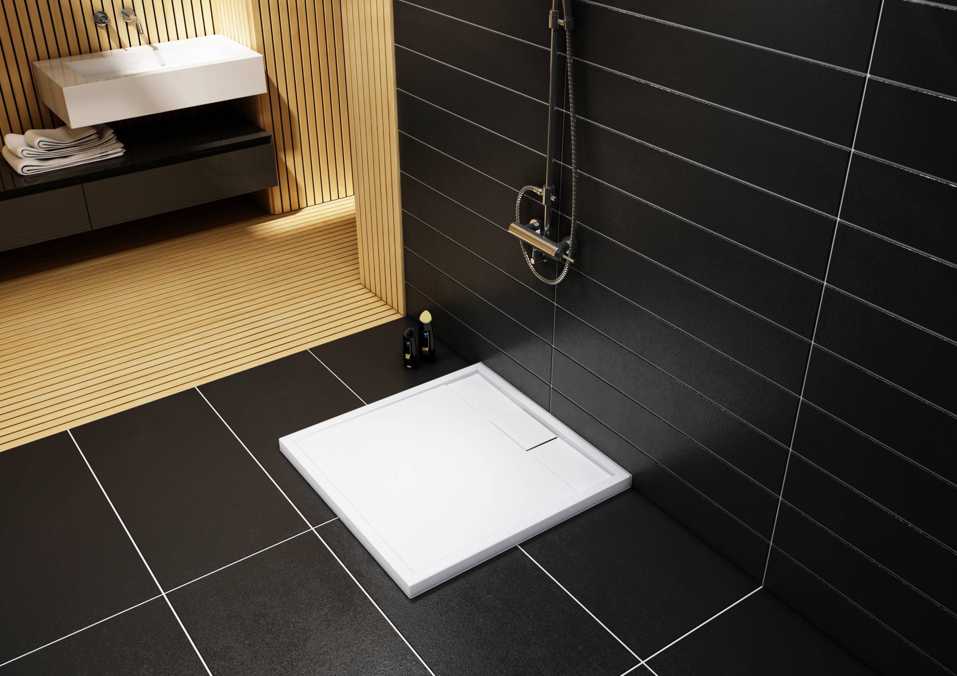 z minimalną spoina silikonową dzięki idealnie pionowym ściankom panelu bocznego oraz wyostrzonym krawędziom brodzika.
