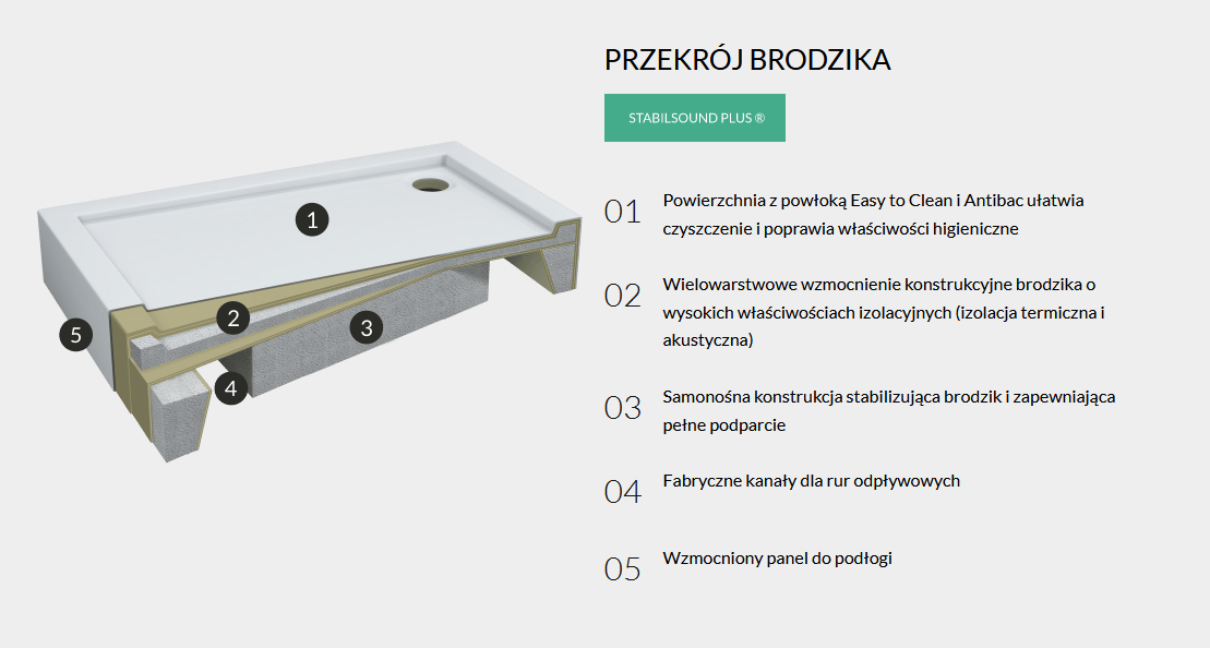 Technologia Stabilsound Plus ® zapewnia wysoką wytrzymałość brodzików na nacisk oraz 100% stabilności.
