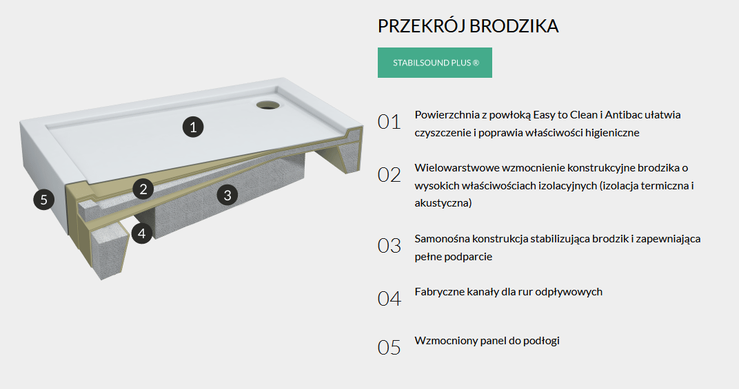 Oprócz brodzików serii Favory Plus w zestawie znajduje się również syfon (przepływ: 1,1 l/s) z chromowanym grzybkiem. Zastosowana technologia zapewnia 100% stabilności (również na rantach), izolację akustyczną i termiczną oraz ochronę hydroizolacji. Fabryczne kanały na rury odpływowe pozwalają na jeszcze szybszy montaż.